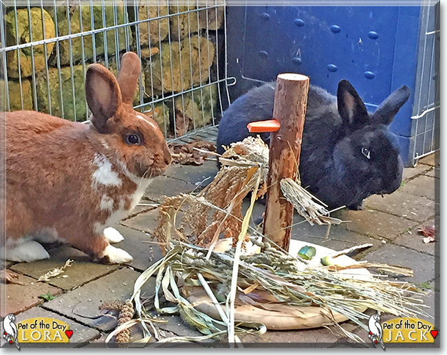 hi, these are my rabbits Jack and Lora. Jack is a black male and Lora is a white and golden brown female. They're both pretty big for a rabbits. They live in a very big hutch in our garden in Nieder-Olm, Germany. They love to eat rabbit food with fresh carrots. Sometimes in the summer they like watermelons very much. They jump in the air and turn around if they are happy.