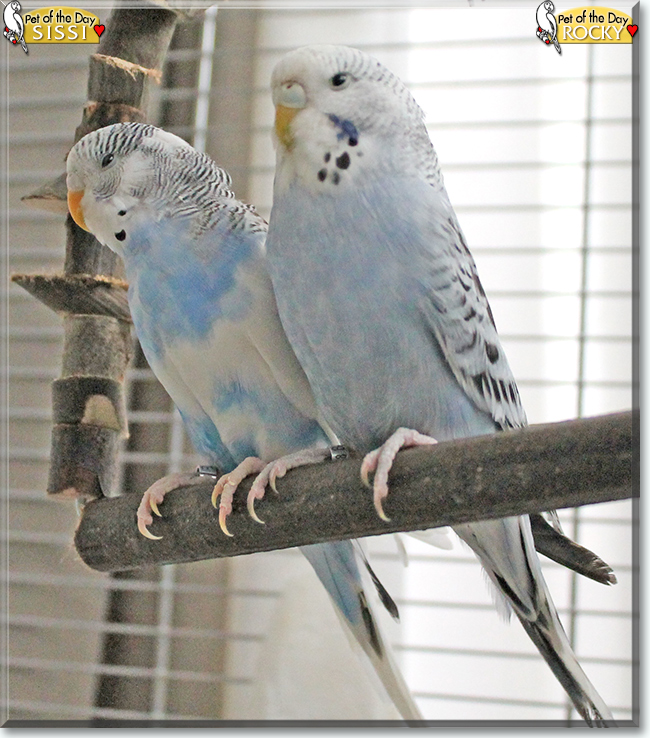 Both sing every morning very loudly, particularly when the sun shines. They eat bird food, fruits and vegetables often during the day and sleep every night at the same place. Sissi and Rocky like music. When we listen to loud music or when we play our instruments they begin to sing. My sister and I have got them for our birthday. I love my budgies. They are both so sweet !!