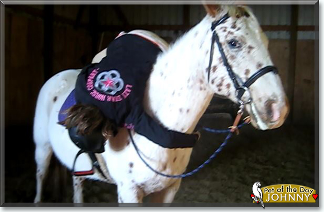 I am an English rider and I mainly hunter jump and Johnny loves it! I have jumped him 2 1/2 feet, although he is capable of more. I love riding him bareback and he loves to run! He is the type of up-in-your-face horse and licks everything! He pretty much doesn't care what I do with him. i can sit on his butt, ride backwards, stand on him and he doesn't care! He is great with kids and dogs. In the winter he certainly is a fluffy beast and in the summer his coat gets even more freckles! I don't know what I would do without this guy!