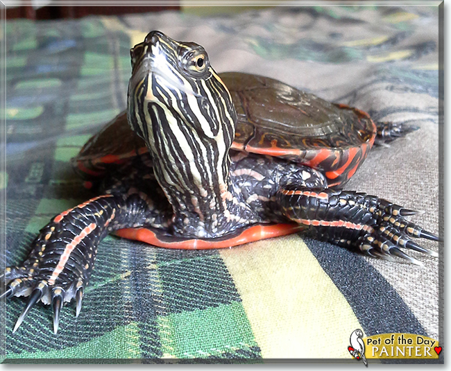 We have had Painter ever since he was a hatchling. He's a very special turtle, because he (and now Pebble) used to be wild. He's also a very cool little guy :). When my younger brother first found him, he was floating around in a fairly small pond, by a lake called Bluegill Lake. He was, at the time, as small as quarter, but now he is a big, strong, and happy turtle. Painter also has his own way of letting us know when he's hungry. He'll swim furiously against the glass of his tank, and when we give him his food, he'll tear it to shreds, lol. He also loves getting new things. One time, when we got him a new tank, he was VERY excited :). My brother loves taking care of turtles, so I think he has a good home :D