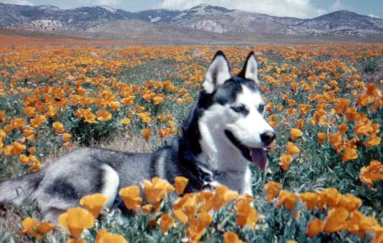 My little angel Koko, graceful girl, black and white, mischievous blue eyes, alert ears, sweet breath, soft fur, quiet, gentle, intelligent, loved to give doggie kisses, loved her squeaky toys, loved everyone she met, everyone loved her. Some of my favorite pictures of Koko were taken one sunny afternoon when the California poppies were blooming bright orange in the distance in the Antelope Valley … we drove until we reached them, and then Koko posed in the poppies with the mountains and puffy white clouds in the distance, the sky matching her "husky blue" eyes. Little Koko, always dancing in happy circles, dancing until a few days before she left us. Little Koko, now sleeping in the sun and dancing in the clouds, will always dance in my heart until I see her again. Koko was born in March 1992 and gave us 17 years of joy until she passed on March 29, 2009.