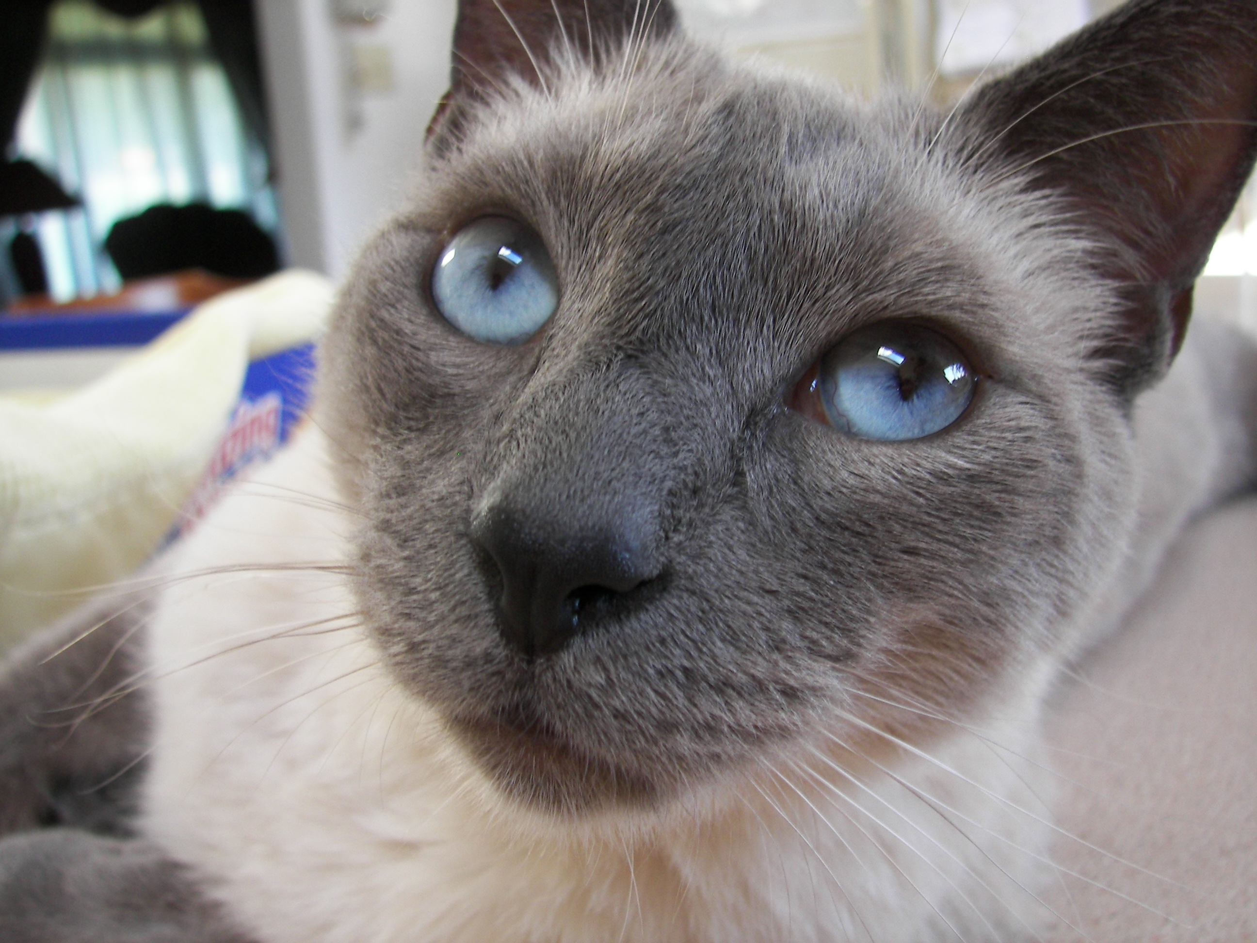 My Coco Puff has the most gorgeous blue eyes ever! And he gets into more trouble, too. If I bring home FROZEN shrimp in a plastic bag from the market, he can smell it and he's relentless until he gets one. He's the baddest, naughtiest cat I've ever had and I wouldn't have it any other way. Best of all is his innocent look when he's been busted and he lets out his little sound of "Boop!" that melts my heart, until I toss him in the basement for a time out, that is. And the look he gives me then is hilarious, as though he's saying "But Mom, I'm innocent!". :p
