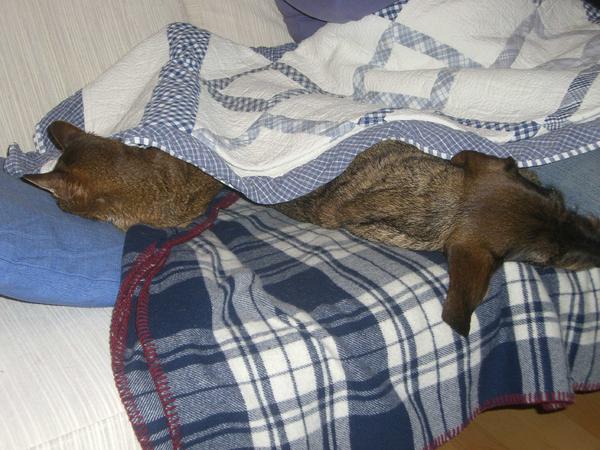 We are back by now and Filou is really well. Thin but he eats and is happy. sleeping in the sun, climbing us (from the lower end of the jeans up to the shoulder in a T-Shirt- ouch ;))