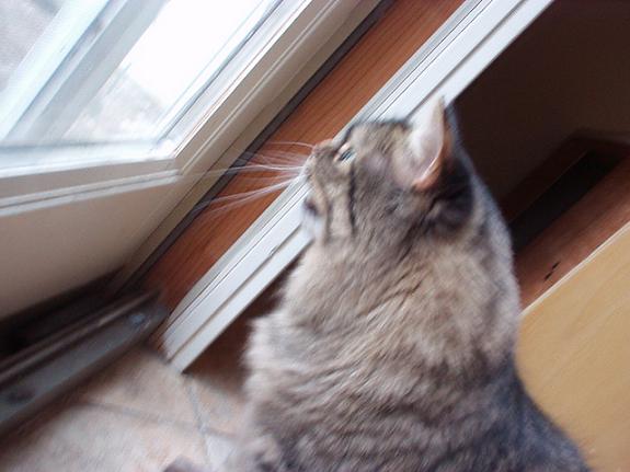 She was meowing for me to pull up the blinds, and then open the window. When she, or Duchess, is watching a bug or bird out the window, she makes a funny noise, like "mr-ow-ow-ow-ow!" It is very cute, too!