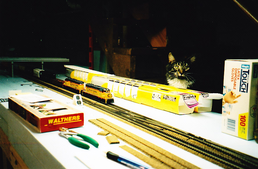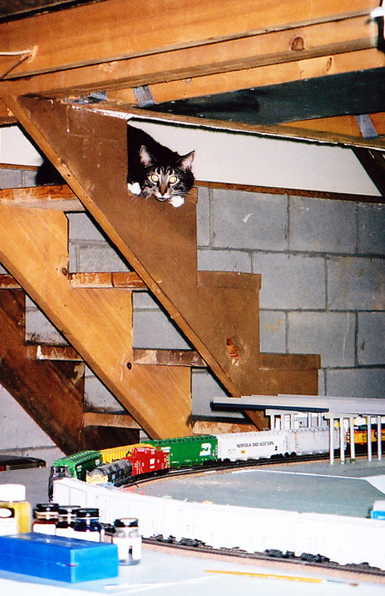 Before Casey moved in with us back in September 2007, I used to let my first cat Chessie down in the basement with me when I worked on my layout down there. He'd wander around on the floor a while and then would go up on the steps to sit or curl up and watch me and the trains.