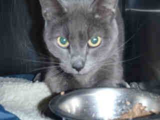 Bree A1290695 is a beautiful Russian Blue and she may have a minor case CH of cerebellar hypoplasia, a neurological condition. This causes her to walk with a wider stance and a bit slower than most cats. She's a little off balance sometimes and has a slight tremor but no head bobbing or head tilt. She gets around very well and should live a normal life. (This condition does not get better or worse with age, but the cat can usually learn to somewhat compensate for it and should have a normal lifespan. Most afflicted animals can lead a fairly normal life if special considerations for the animal's disability are taken by the pet's owner.) Bree shows less symptoms than many CH cats that I've seen.