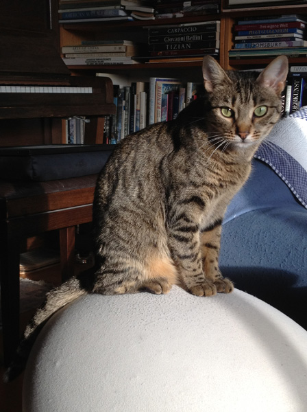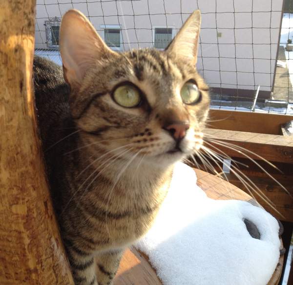 Kiri was not amused. Even the shorter height to the cellar window was too high for her, so when I had opened the window I got on a ladder inside the cellar (from there, the window is under the ceiling), then put a big bath towel down the wall into the outside shaft so she could reach up which she couldn’t do with the concrete wall. She reached up and when I saw her little face (with airplane ears) I grabbed her under her arms and pulled her up. Little girl went up to the flat in no time and right to Orion’s bowl gobbling down all that was left.