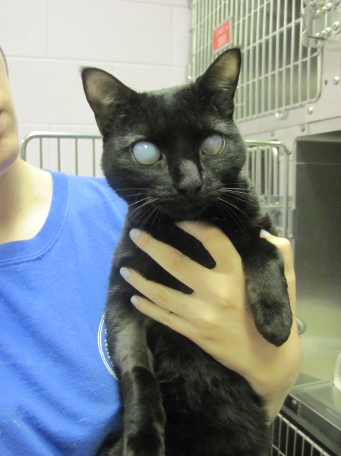 Blind cat - #4834: came in as a stray March of this year, (male, DSH) has cataract in right eye, left eye has ulcer, we have him on medication but it would be best for this cat to go into a rescue or experienced cat-home where someone can take on his full medical care where he will be out of the stressful shelter.