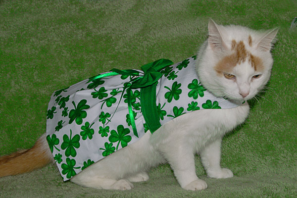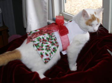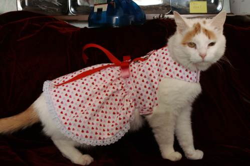 Thank you both for the compliments. Karen, Althea doesn't particularly enjoy wearing the dresses, but she doesn't fight to get them off. I bought all "harness dresses"; they have dee's sewn in so that I can hook her leash directly to the dress. She doesn't usually walk on the floor - but will when she's ready to lead me out the door to the vehicle! LOL - but she rides on my shoulder, which leads to some interesting looks from people who've not seen her before. As I walked down one hallway, I passed an older lady who was walking more slowly than I. I was several yards past her when she asked, "Is that a *real* cat?" She thought Althea was a stuffed cat until Althea moved her tail! We've had to stop to have photos taken, too. People who don't know my name evidently refer to me as "the cat lady." :D