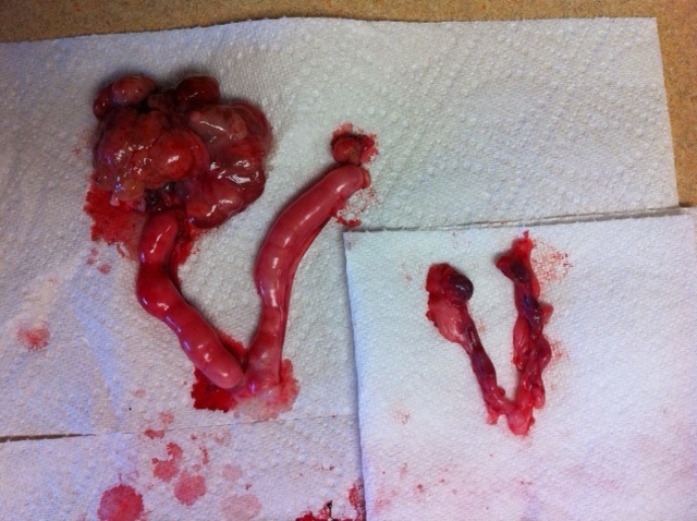 What you are looking at is a healthy uterus and ovaries on the right of a 35# dog.