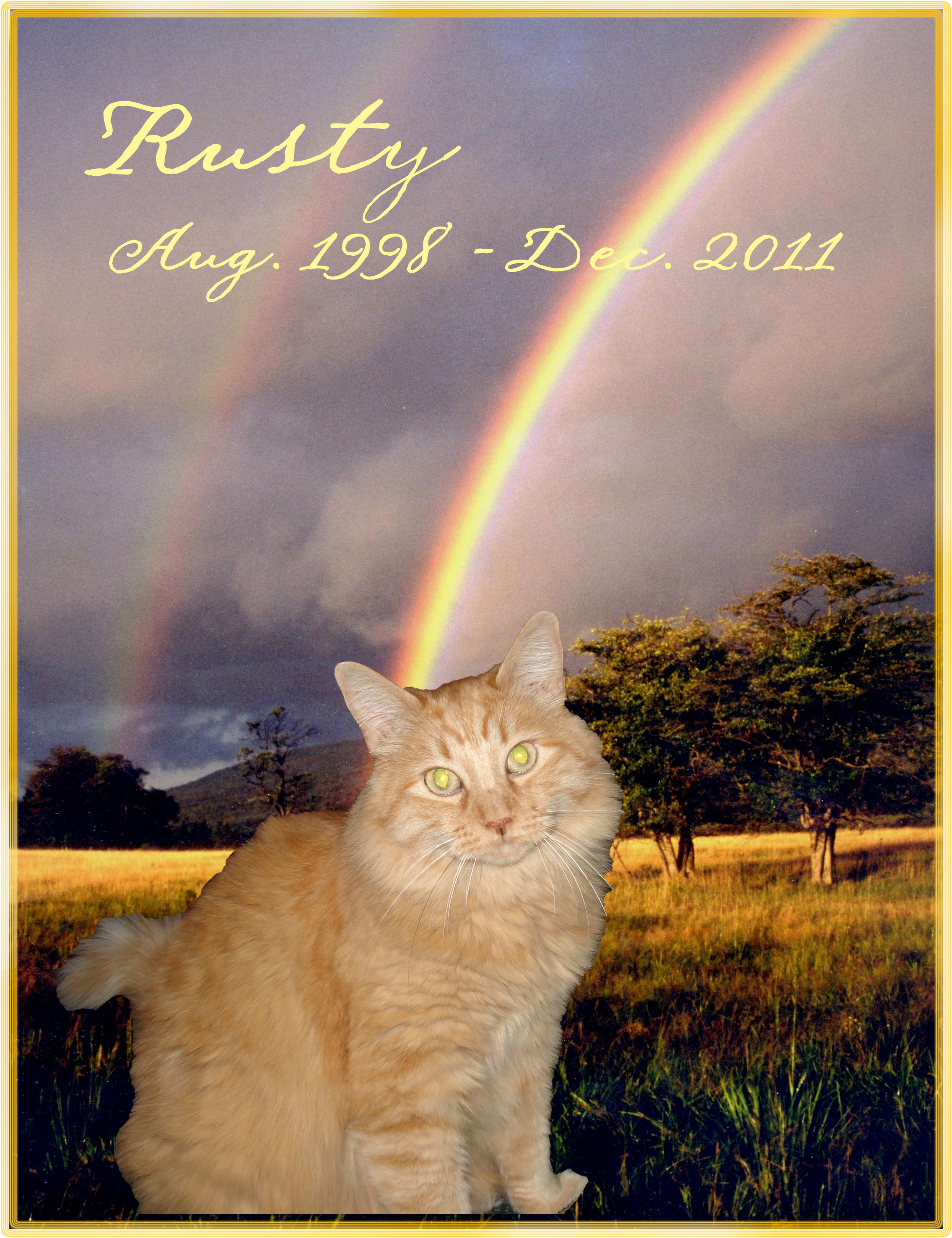 Maerlyn, thank you so much for the beautiful picture of Rusty at Rainbow Bridge! It brought an instant flood of tears to my eyes, it touched me so much. Yes, he was very sweet. He never scratched me or anyone else, except maybe accidentally during playtime. And I never, not even once, heard him hiss! He did however yowl sometimes when he wanted his food. Did you ever see my youtube video of him before he passed? Here it is. He was so thin in it. He used to be a gentle giant.
