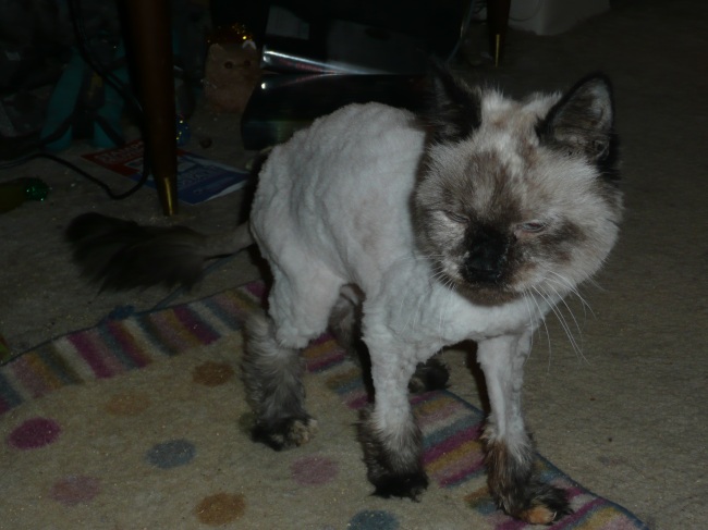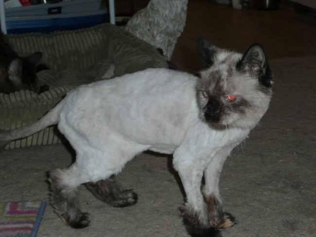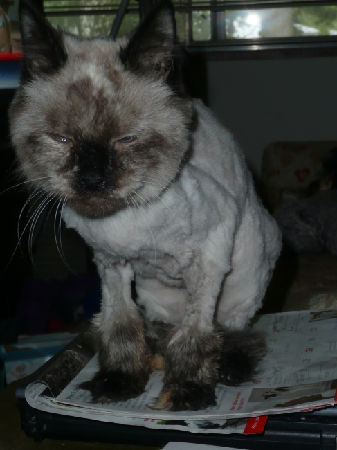 Lavinia is a medium-hair-length cat of Siamese/Himalayan heritage, and she has quite a tendency to get mats. They haven't been too bad for the most part, until lately. She started getting more than I could keep up with, so I made an appointment for her with a groomer.