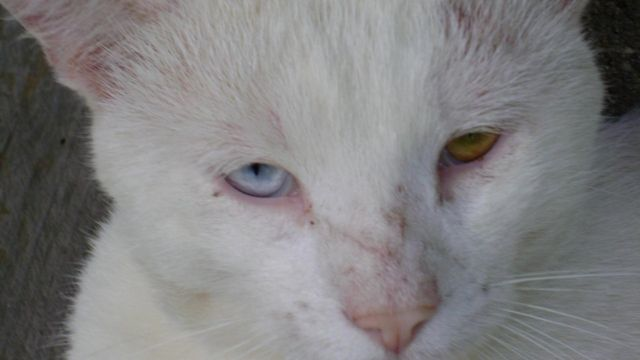 Ices is a beautiful pure white cat with one blue and one yellow eye. He is neutered and has his rabie shot. I have attached a couple of pictures of Ices and as you can see he is a little beat up. Ices does not get along with the male cats outside and fights with them. One of the little ferals is now limping and I am hoping he will be okay. I have two kittens across the street in a woodpile that I also want to have fixed and provide warmth in the winter; but I cannot with Ices. None of the rescue places with take him unless I take him in. I cannot do that, I have 2 dogs and 2 cats in the house already. I do not know what to do, Ices needs a chance and I am trying my best to give him one. If either of you can help Ices.