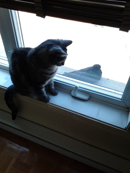 First I'm glad that the pic did not come out HUGE at least it seems not. My Dorry cat was not transfixed by a peaceful dove, but by a typical city-dwelling pigeon. I live on the top floor of my building and therefore do not encounter much in the way of natural creatures. There is an idiomatic saying "cat among the pigeons" which means: "If something or someone puts, or sets or lets, the cat among the pigeons, they create a disturbance and cause trouble." That's what made me grab my cell and snap this "reality shot." The fact that the pigeon stayed on a very high windowsill for about 2 hours was amazing, the fact that Dorry kept jumping back and forth watching it without trying to swat it was even more amazing. For a while I thought that perhaps the bird was injured, but eventually it just up and flew away to do whatever it is that pigeons do for amusement, perhaps it went off to find a statue to perch on. ;)