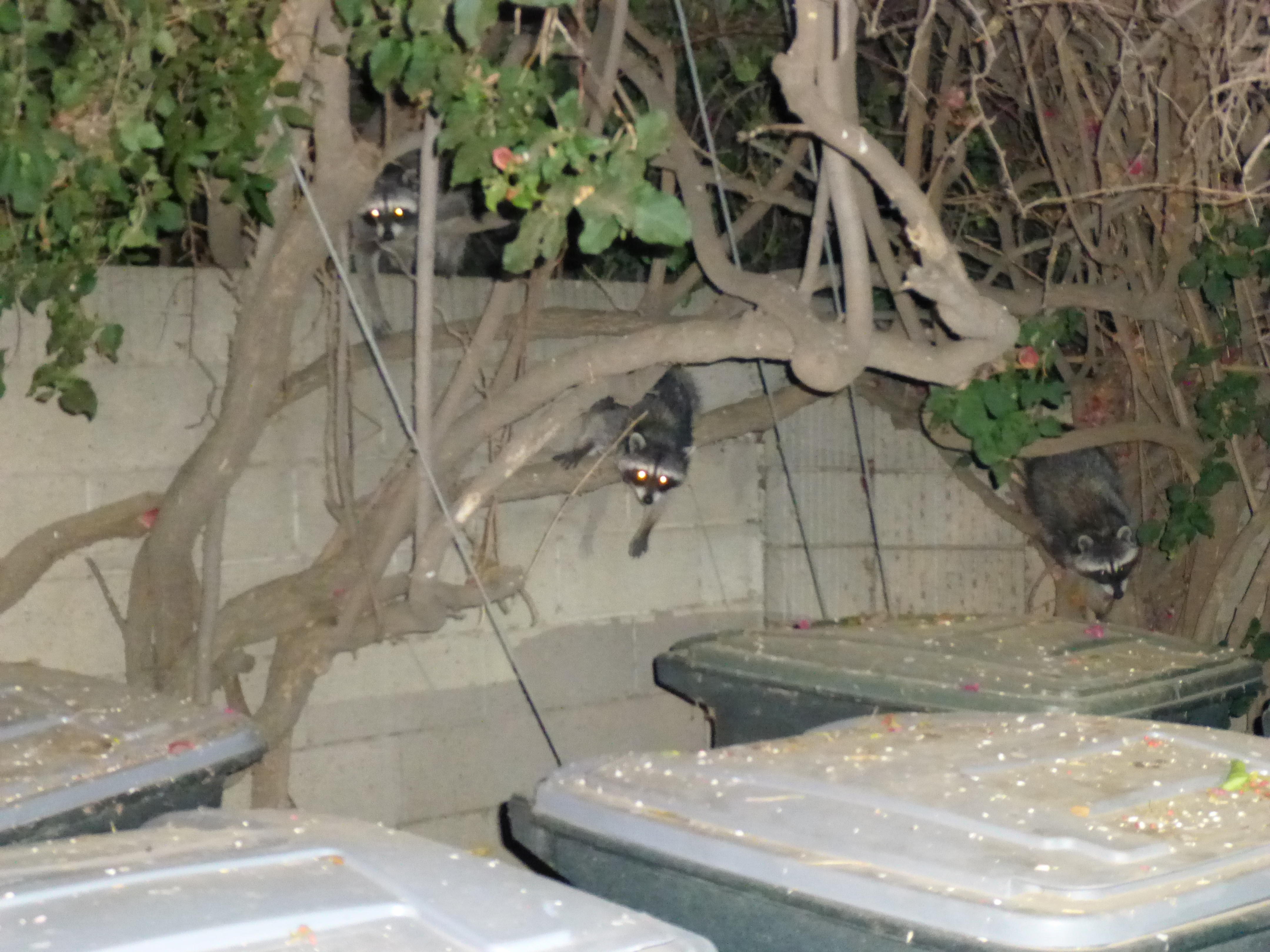 I had some dry cat food left so I threw it behind the trash cans so I could get some pictures. These are young ones and one of them actually barked/hissed at me! :-) I kept a lookout in case momma was around. This was a one-time feeding...very adorable but too dangerous to encourage.