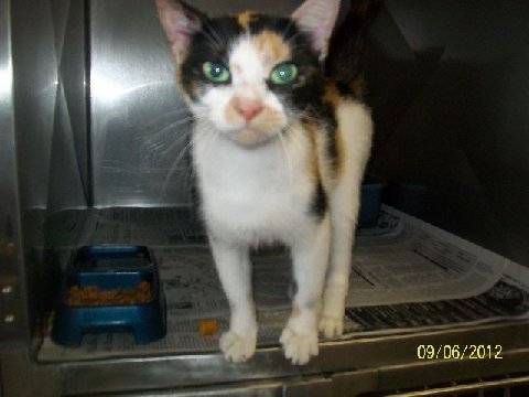 > CALI IS A 1 YR OLD FEMALE CALICO THAT HAS HUGE GORGEOUS GREEN EYES. SHE