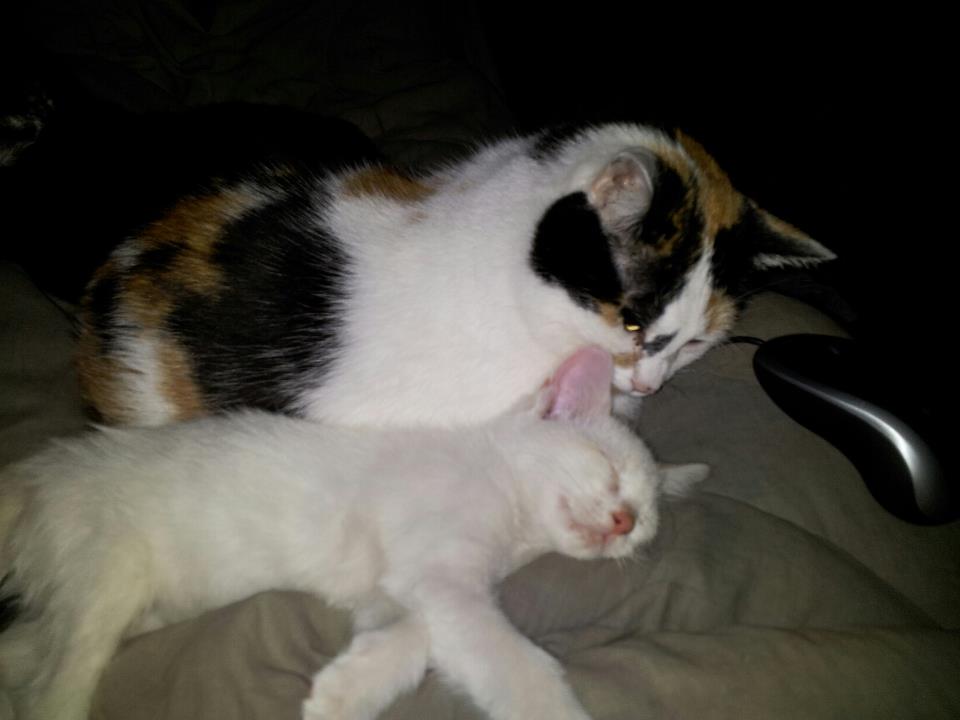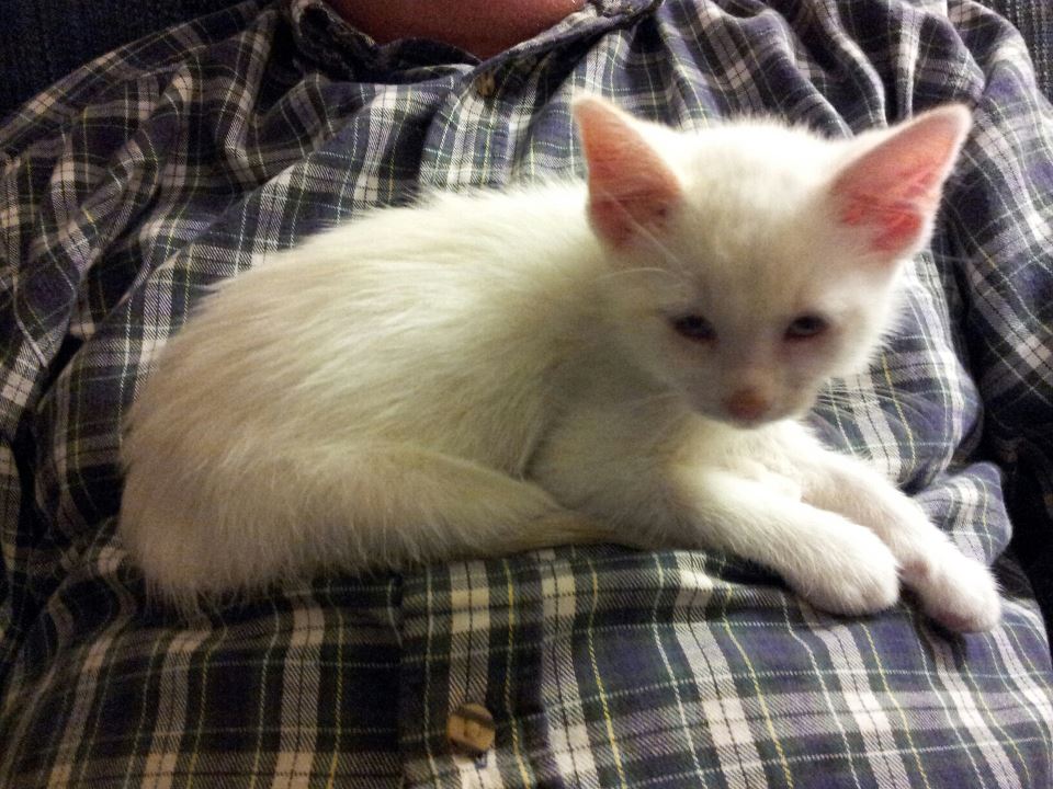 Boo was found on a busy street corner early in the morning on October 12th. She was taken to a local vet. and treated for ear mites and worms. Otherwise she is very healthy. She is approximately 8 weeks old, and weighs 2 pounds, one ounce. She stayed at the Vet's office today while I was at work, and I had them give her first shots to her to get her vaccinations started. I brought her home with me tonight. She got a bath immediately upon coming home, then ate, used the litter box, and settled into some serious exploring and PLAYING! She is getting along well with her four brothers......Shadow, Spook, Kingston and Casper.......and three sisters......Little Orphan Annie, Dottie and Sammie. She looks a LOT like Casper did when I brought him home a year ago.......