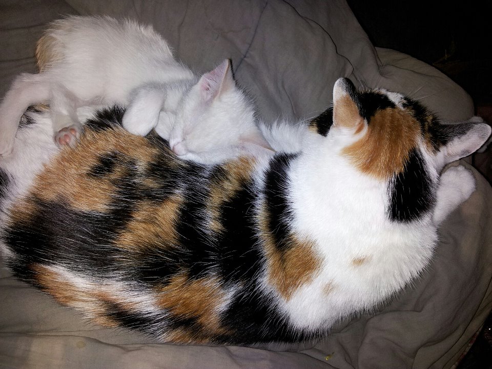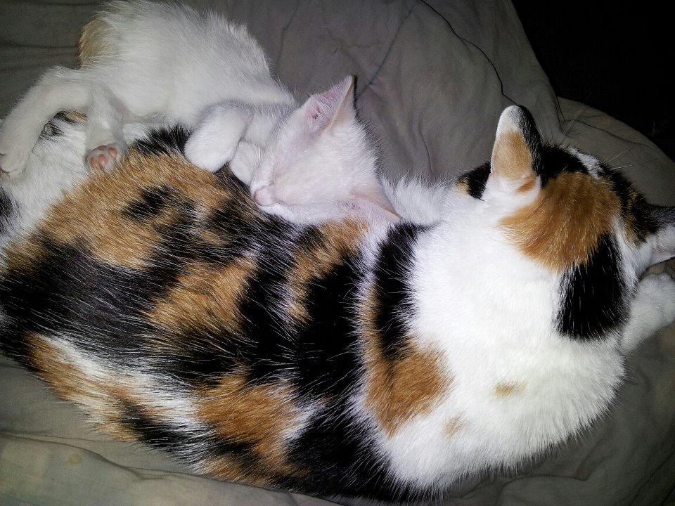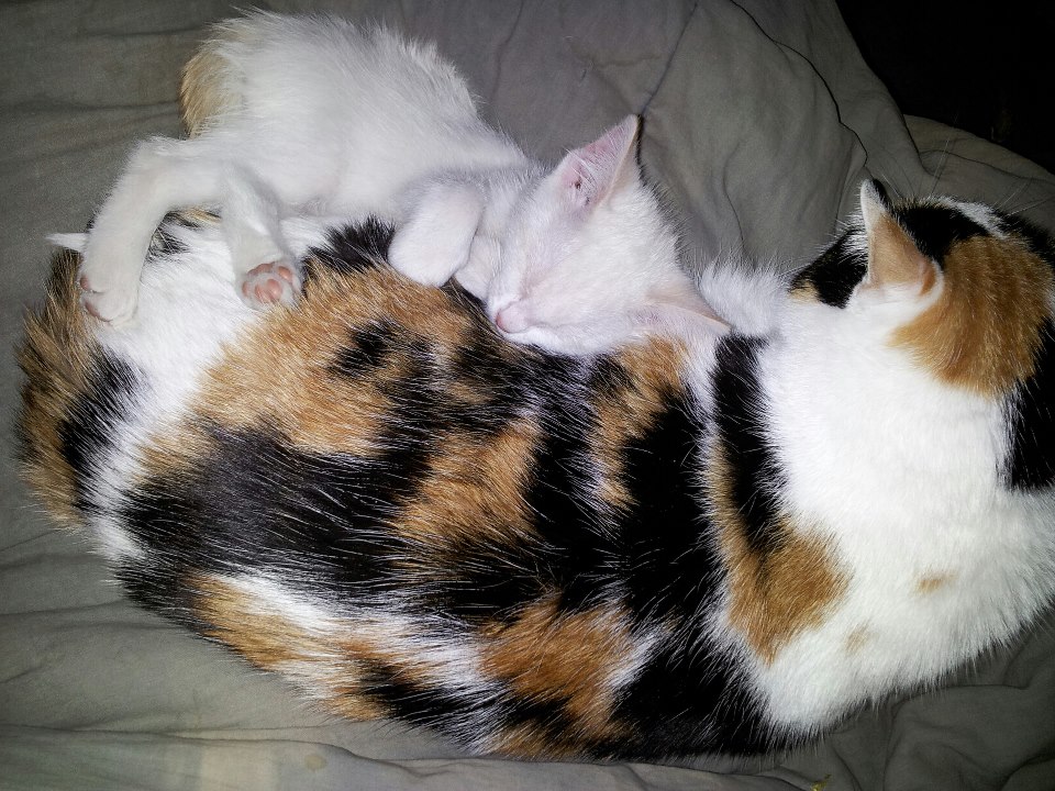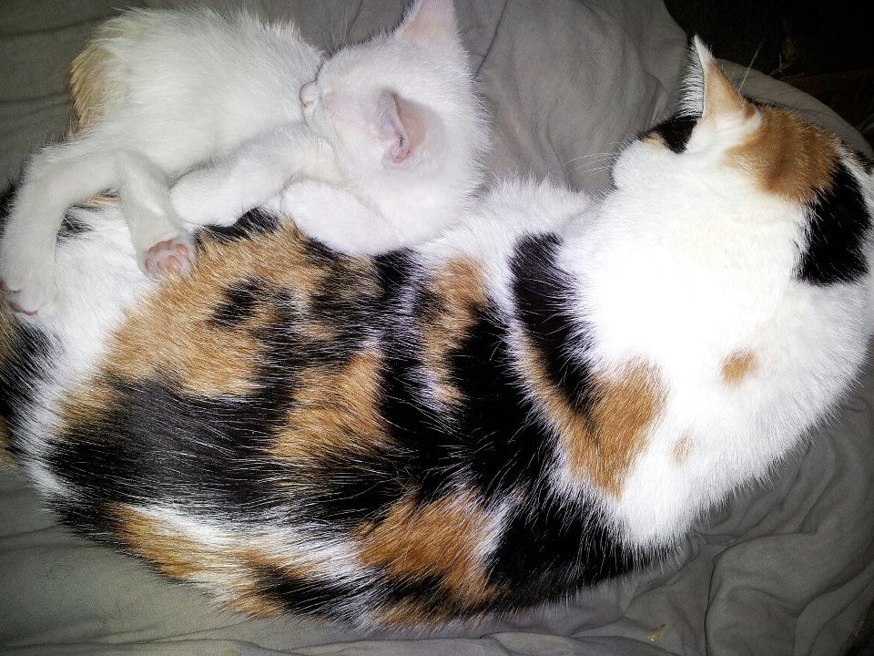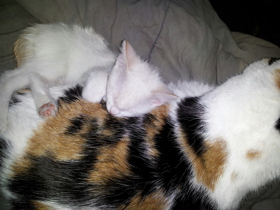 Just one day after being introduced, Boo and Annie seem to have bonded as "snuggle buddies" and I LOVE these pictures because they show just how small Boo really is next to an adult cat! :love::love::love: