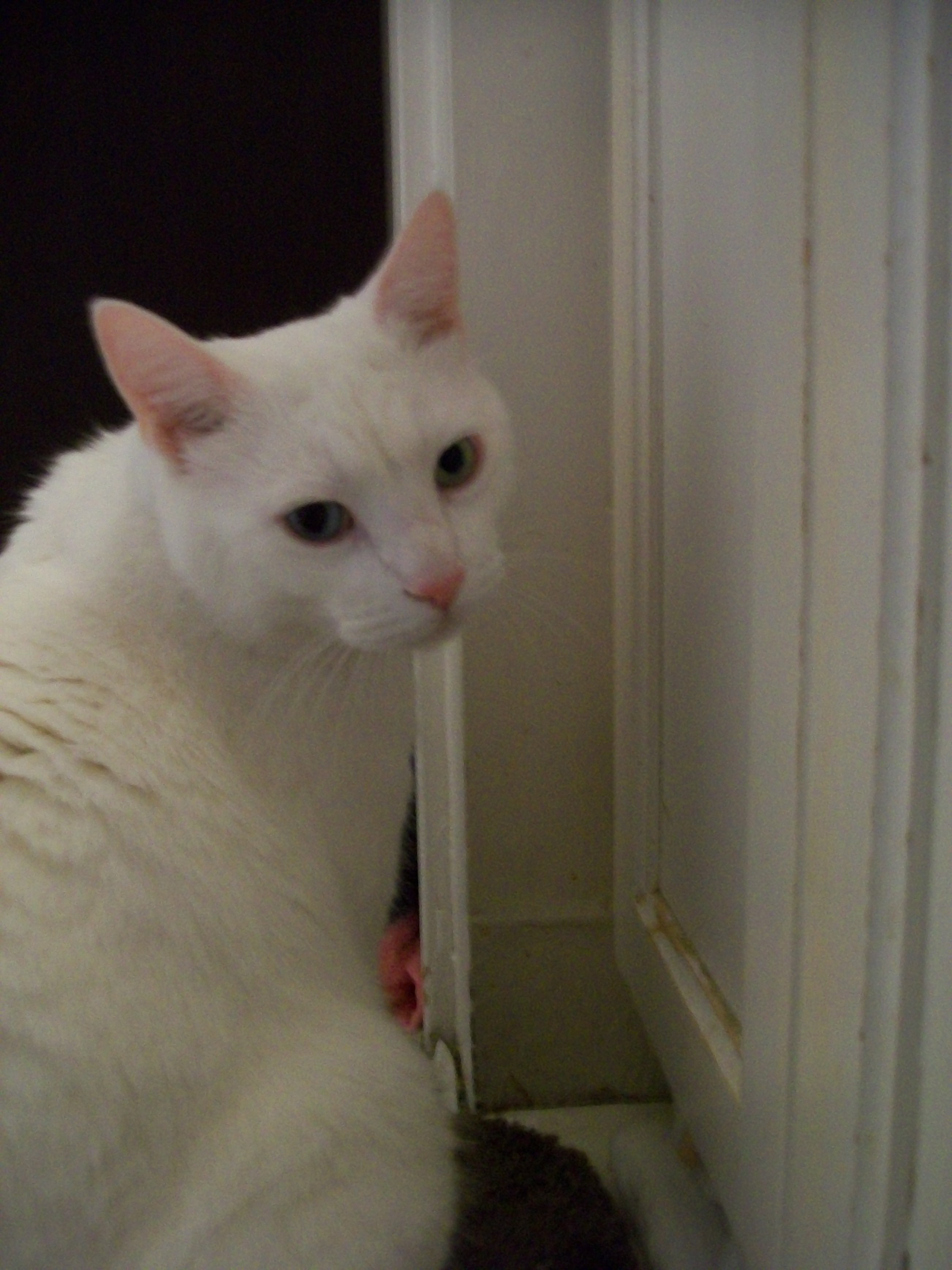 Bowie is a BIG kitty, who’s slightly misunderstood. He was minutes away from being put to sleep when we saved him. He has one blue eye and one green eye. He's litter trained and when we first got him here, he was very scared. We believe Bowie was abused so he needs a gentle hand. He does like to give love bites (but not hard) sometimes, but he says that’s all part of his charm. We would keep him, but we feel he would do better with someone with fewer cats. If you're interested in this big, handsome lug, e-mail me at [email protected], and we'll set up a chance for you to meet him. He's neutered, FIV/FELV negative, shots up-to-date and micro chipped!