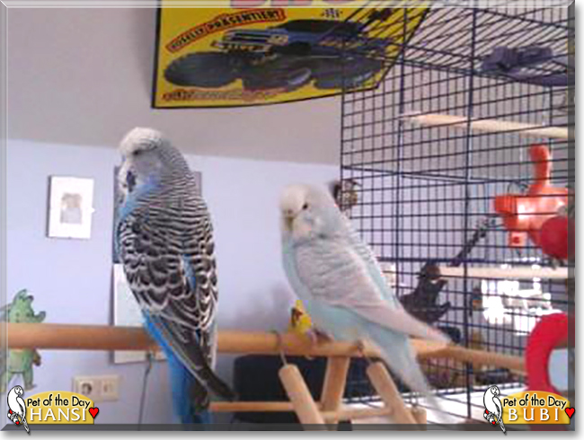 What beautiful blue Budgies you are, Hansi and Bubi, beautiful inside and out, in looks and in spirit! How lucky your human is, having two beautiful, best feathered friends in you two, her/his source of countless smiles, joy and laughter! And how lucky are you, Hansi, having a mentor and protector in Bubi!, a big sister to show you the ropes! It's clear you two share not only an unbreakable bond of love and trust with your human, but with each other as well...Sounds like one big happy family to me!