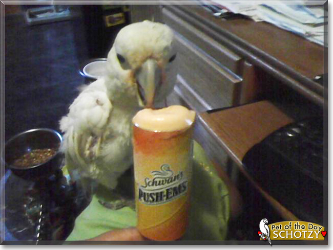 Dearest Schotzy, you are adorable! What a gorgeous Goffin's Cockatoo you are, with those pretty white feathers and that face that looks like it has a big smile on it. You are so cute in all those great photos, sampling various taste-treats. You have five bird-buddies and Brutus the Lab-mix doggie as housemates. You love to stay close to your dear Mama, following her throughout the day. You all love each other very much, don't you. What a wonderful love-filled home you share!