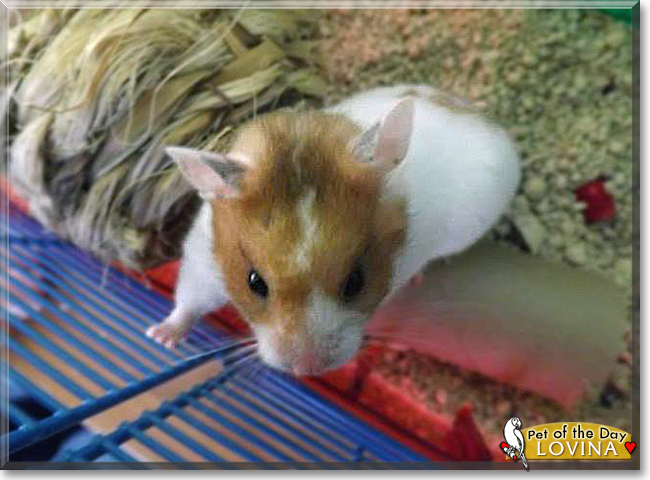 Dearest Lovina, what an utterly adorable Syrian hamster you are! You are so pretty with that soft-looking colorful fur and that sweet face with the little pink nose and the dark eyes. And what a delightful story you have to tell! You were a surprise gift for your dear person, and you and she/he have become the best of friends. You are shy but playful, and you enjoy running on your wheel and finding other ways to become physically stronger. You love running around in the bathtub and eating Yogi drop treats and being petted by your dear person when you hold still long enough. You and he/she love each other very much, don't you. What a wonderful love-filled home you share!