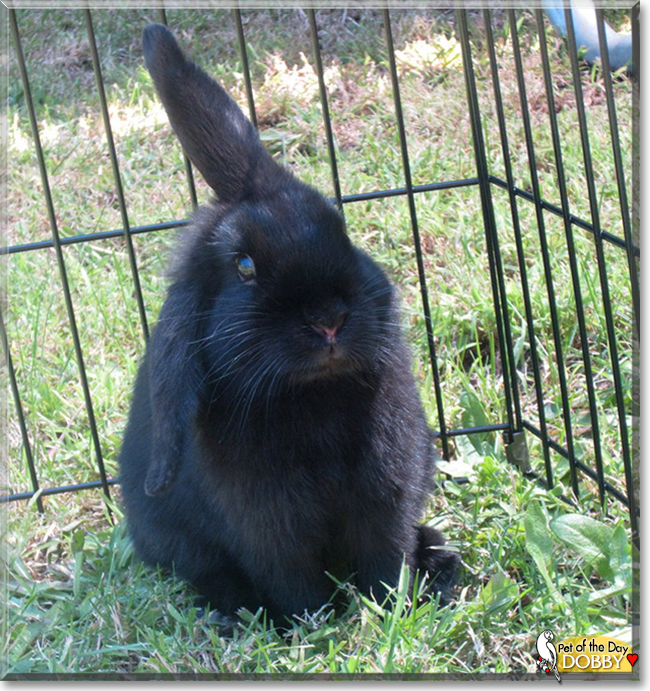 I know Dobby is a boy but he has such a sweet face! Happy Pet of the Day, Dobby. You are such a handsome fellow, and I love your black fur and your very special ears. I have had a black bunny myself and she had ears that floppped a bit. Her name was C-squared. That was short for Calla Cinders! I think she and Dobby would have made a lovely couple, but Australia and the United States are a bit far apart, eh?
