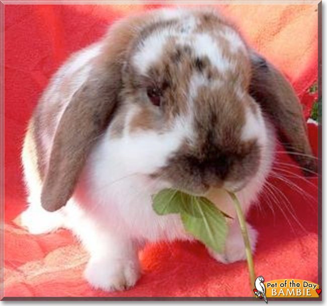 What a sweet bunny you are, Bambie! I like your white and brown coat, and your fur looks so soft to pet! I like your cute lop ears, too! You are very special! I hope you and Klopfer are having lots of fun with your family today! Happy Bunny Pet of the Day to Bambie!
