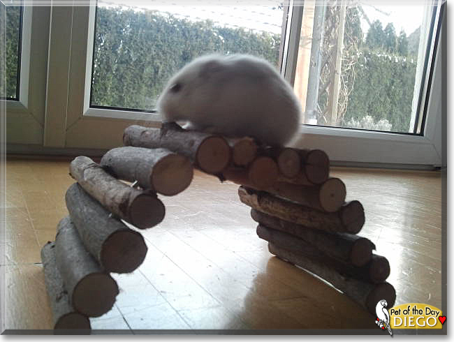 Dearest Diego, you are an absolutely adorable little hamster! You are so cute with that soft-looking fluffy white fur. And what a delightful personality you have, too. You and your dear person are the best of friends, and you lick his/her hand when you are very happy. You and she/he love each other very much, don't you. What a wonderful love-filled home you share!