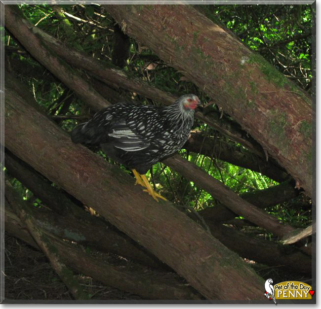 What a beautiful, utterly precious Silver Laced Wyandotte you are, Penny! I SO enjoyed meeting you and the gang today, reading your heartening backstory, learning of the happy, care-free life you and the gang are living, seeing all of those heart-melting photos! How lucky your mommy is, being surrounded by so much feathered and furry love, having a "helping hen," a best friend and loving companion in you, sweetheart! You're just as special as can be, Penny, beautiful inside and out, and so very deserving of your big day in the spotilght!