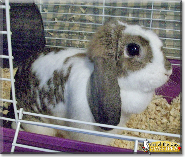 Hello, pretty bunny Sweet Pea! What a lovely girl you are with your soft brown spotted fur and your lop ears! I would be glad to give you a pat (or two or ten)- since I can't, though I hope your caring person will do it for me!
