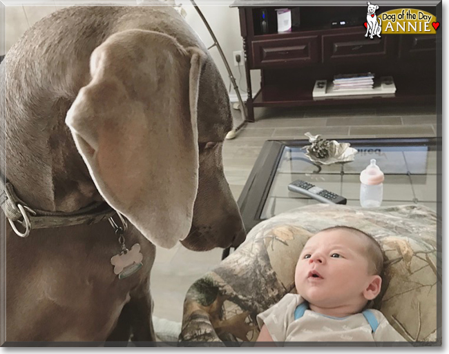 Dearest AnnieBelle, what a stunningly beautiful Weimaraner girl you are! That fur is so pretty and soft-looking, and you have the sweetest face! Thank you for sharing all those great photos with us. You are gorgeous in every one of them, and to see you with your dear family members, especially new baby brother James David. You have the most delightful personality, and you and your dear people all love each other very much, don't you. What a wonderful love-filled home you share!