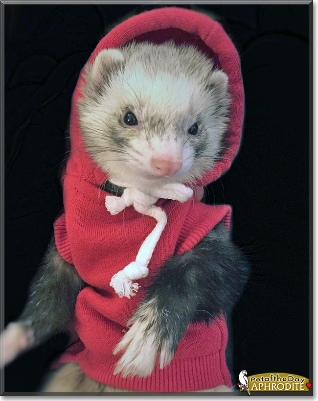 Dearest Aphrodite, what an adorable little ferret girl you are! You are so cute in all those great photos, with such pretty, soft-looking fur and that sweet face. How nice to see you with your dear Dad, and you're precious as can be in your pink hoodie! And what a terrific personality you have, too! You are super-loving and caring and playful. You are your dear Mom's first ferret, and she and Dad are both delighted with you. You make them smile with all your energy and antics. You have a boy ferret and a pup for housemates! You and they and Mom and Dad all love each other dearly, don't you. What a wonderful love-filled home you share!
