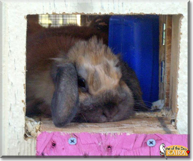 Dearest Kaira, what an adorable Holland Lop Rabbit you are! You are so pretty with that soft-looking fur and the sweet face. Thanks for sharing those great photos with us! it's so nice to see you and your dear Kirstin cuddling up together. And what a delightful personality you have! You were first meant to be a breeder, but that didn't work out well, so now you are a loving and beloved and treasured pet. You are very affectionate, and you love to be loved and to be scooped up and cradled like a human baby. You and your dear Kirstin love each other very much, don't you. What a wonderful love-filled home you share!