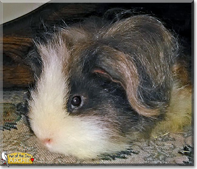 Dearest Archie, what an absolutely precious little Peruvian Guinea Pig you are! You are so cute with that beautiful glistening fur and that sweet face with the one lovely big eye showing. You look calm, but you are also very athletic. You like to stand on your hind legs for treats and to run around and get some exercise. You and your dear person Alise love each other very much, don't you. What a delightful love-filled home you share!