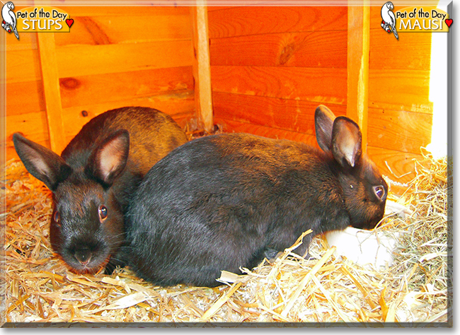 Dearest Stups and Mausi, what beautiful bunnies you are! You are so pretty with those soft-looking black coats and the sweet faces with lovely big eyes. You are twins, sister and brother. And what a nice story you have to tell! You have your own rabbit villa, with good clean hay in it, cozy in the winter and cool in the summer. You have a huge outdoor area in front of the villa. Every day your dear person visits you and feeds you and lets you out to play when the weather is nice and plays with you with a little ball. You all love each other very much, don't you. What a delightful love-filled home you share!