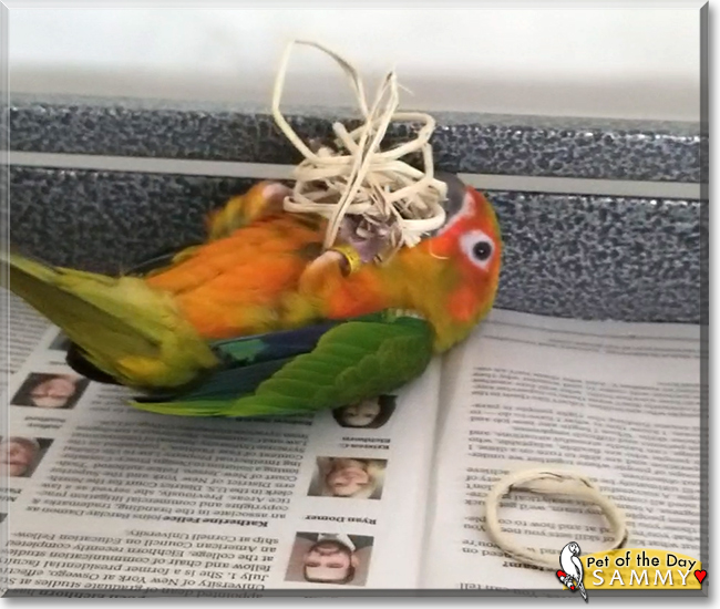 Dearest Sammy, what a beautiful Sun Conure you are! You're so pretty with those gorgeous feathers and sweet face, and what a delightful personality you have, too. You are quite the accomplished Super Star in all those terrific photos! You are your dear person's very first bird, and what a great introduction to the avian world you are for him/her! You love each other very much, don't you. What a wonderful love-filled home you share!