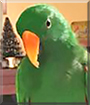 Dearest Matisse, you are adorable What a beautiful Solomon Island Eclectus you are! You are gorgeous with the green feathers and the orange beak, and what a fascinatingl personality you have! You are "The Drainer of Food Budgets," indeed. You are very particular about what you will eat and how you want it served to you, and you have your dear person very well trained in this regard! You and she/he and your Cockatiel housemate Lucy all love each other very much (even if you don't always act as if you do with Lucy), don't you. What a wonderful love-filled home you share!
