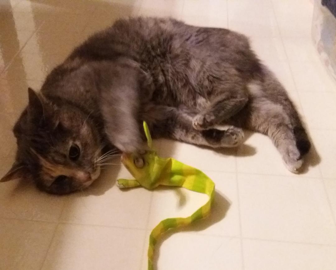 Miss Kitty will turn 17 in 5 months, and even though kidney disease is sneeking up on her, she feels well enough to play and run through the house like a mad kitty.