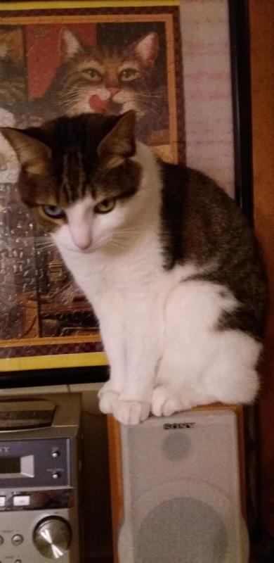 Kitties not only fit into tight spaces, they also keep themselves balanced on very narrow objects, like Olive on a stereo speaker.