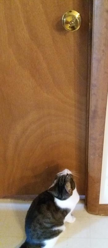 Cute picture of kitty looking up; at door. What I did was get a kitty scratcher door hanger with catnip on and my cat seemed to settle down.:):):)