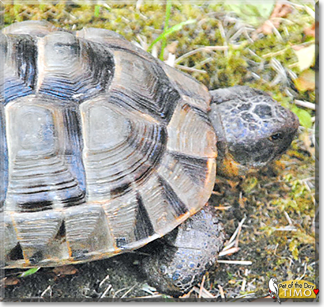 What a handsome Moroccan Tortoise are you! Your shell, its coloring and markings, are simply gorgeous! You're one lucky guy, Timo, having a guardian as devoted and caring as yours! And while I know you and your shelled buddies Luca, Sahara, Afrika and Atlas are currently hunkered down, chillin' in the frig, napping, it won't be long (mere days!) before you and your human are reunited, those warm summer days spent exploring your garden, soaking up the sunshine, munching on flowers, plants and bugs, just a few months away! Your human is one lucky guy/gal, having a best shelled friend in you, Timo! You're terrific! And considering your species long lifespan, so many, many more years of shared love and companionship for you and your human!