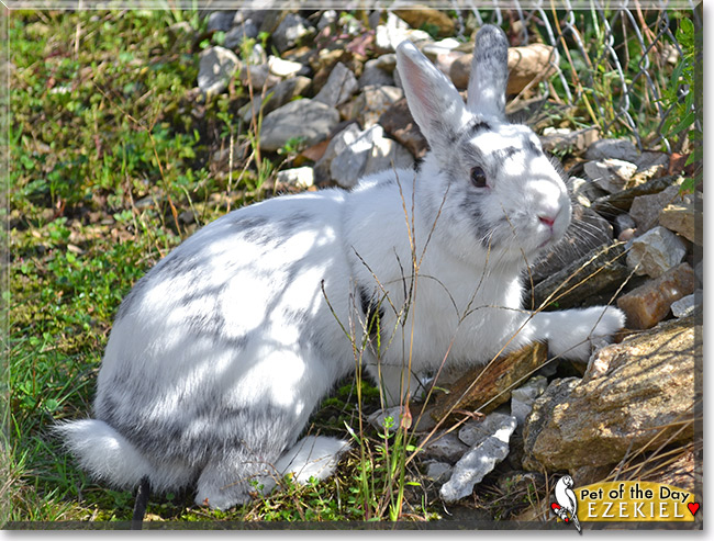 What a gorgeous fellow you are with your white and silver fur! I am so glad that your forever home was carefully chosen, and that you are much loved! Your person takes extra-special care of you, and I'm sure you will shine as a therapy bunny! I, for one, would love to give you a huge hug (or two or ten!)! Happy Bunny Pet of the Day to Ezekiel!