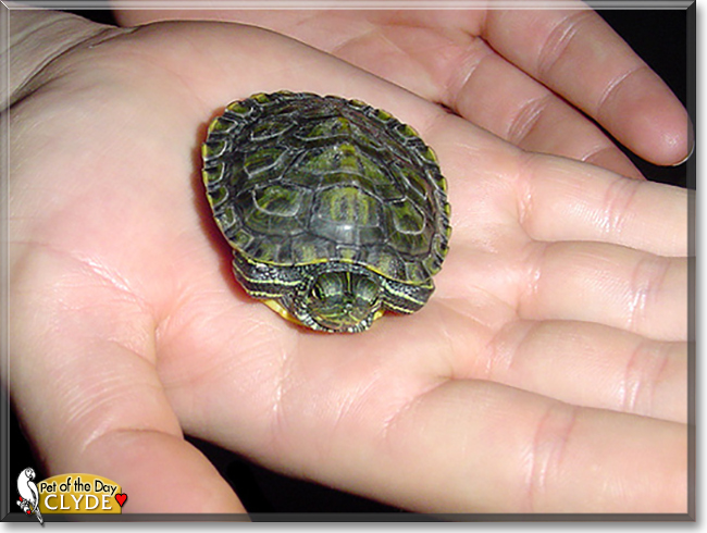 What a cutie Red-Eared Slider you are, Clyde; so handsome and packed with personality! And just look at that precious face!!! Your human is one lucky guy/girl, having a beautiful, outgoing, sweet and gentle best shelled friend in you, Clyde! You're a gem!