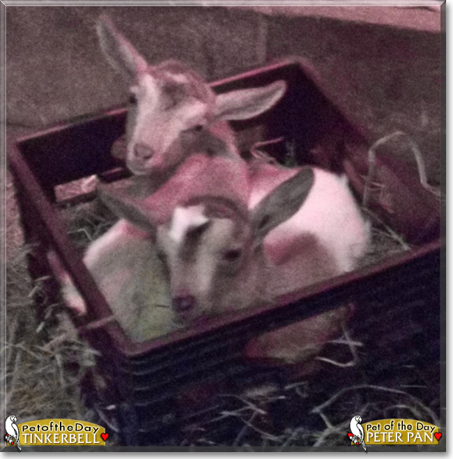 Oh, what a precious pair of Nigerian Dwarf kids you make, Tinkerbell and Peter Pan! After seeing your heart-melting photos, well, I may never stop smiling!:D I simply adore goats, so seeing not one but two beautiful kids being honored here today poured a whole bunch of warmth and *sunshine* onto my cold, stormy day! What happy, fun filled lives await you two cuties; you Pete, down on the farm with your new family (complete with a bestie and lots of kids loving on you); and you Tink, hanging back with your mom, proudly strutting your stuff at those 4H fairs! But for now, nothing but carefree days spent bouncing about your mom, inviting yourselves into the house (watch out, kitties, lol), eating and snoozing under the warmth of that heat lamp, being loved and pampered to pieces!