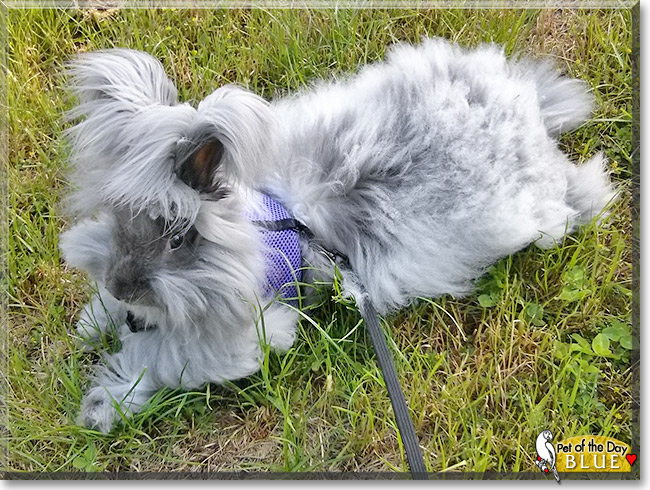 What a beautiful, utterly precious English Angora bunny you are, Blue! Your incredibly long, flowing, "soft as cotton" blue colored coat is simply gorgeous!:eek: Oh, what a beauty you are, indeed! No doubt it requires a ton of time to keep your coat looking so beautiful, but so well worth the effort! And just as impressive as your stunning good looks is your sweet, calm demeanor, that is when you're not running around, letting loose some of that unbridled energy!:D Gentle and loving, energetic and spunky, just as sweet and beautiful as can be! You've got it all going on, Blue, every human's dream furkid! How lucky your mom/dad is, having a source of never ending joy, love and laughter in you, Blue! You're a gem!