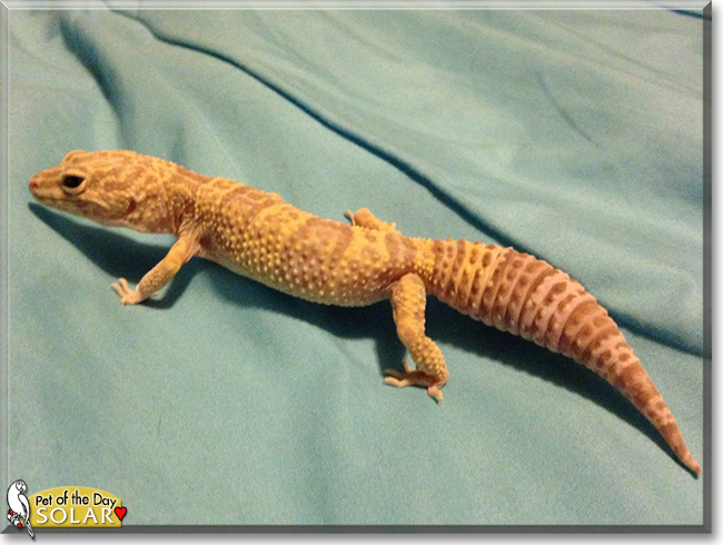 What a gorgeous Tremper Albino Leopard Gecko you are! Your "sunny" orange coloring is beautiful and so perfectly reflects your bright and sunny personality! And oh yes, that IS one most impressively "fat" tail!:D I learned from a Gecko loving friend of mine that that truly is the sign of a happy, healthy boy/girl! And your photos...LOL! That one of you inspecting your empty bowl is too funny! And of course you're spoiled! A girl as sweet and loving, as precious as you, deserves nothing less, only the best! How lucky you are to be so loved, Solar, and how lucky your human is, having a beautiful best friend friend and loving companion in you!