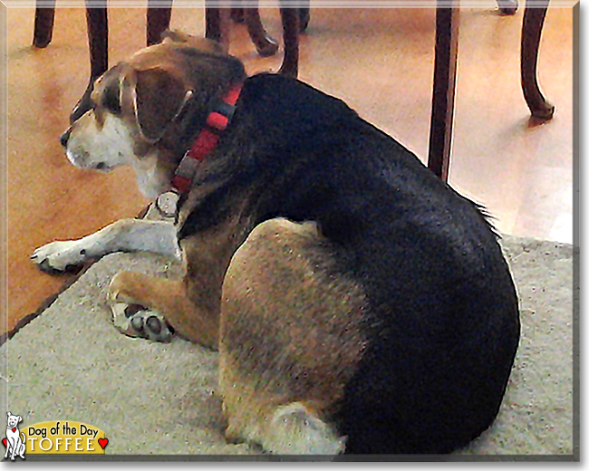What a most precious girl you are, Toffer! That sweet face of yours, your soft, love filled brown eyes, melt my heart! Your parentage may be unknown, but you're looking quite the Beagle girl to me, and so perfectly named, being as sweet and loving as you are, the ultimate Velcro pup!