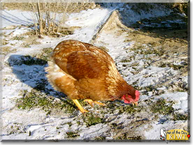 What a beautiful Brown Laying Hen you are, Kiwi. Your coloring is gorgeous, and your "missing" tail feathers only adds to your charm, not to mention giving your family the honor of actually watching you lay those eggs! Loved learning of the origin of you name, Kiwi...oval and brown, just like your beloved namesakes, and every bit as unique, every bit as special; just sweet and loving as can be! No surprise to learn that everyone wants to meet and make friends with you, Kiwi! You're a treasure! Your family is so very lucky, having a sweet and loving best feathered family member in you, Kiwi!