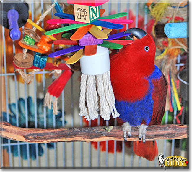 I can only imagine what a joy it is to wake up each morning to the sight of your gorgeous self, your cheerful morning greeting! Your ruby red and blue plumage is stunning, Ruby! But it's your intelligence, your joyful and playful personality; your love for people and the very special bond you share with your human that make you the EXTRA special girl that you are! I can just picture the looks of wonder and surprise, the smiles on the faces of your fellow shoppers when they see you come tooling down the aisle in your shopping cart, giving a cheery hello to all!:cool: How lucky your human is having a feathered family member as beautiful and loving as you in her/his life!